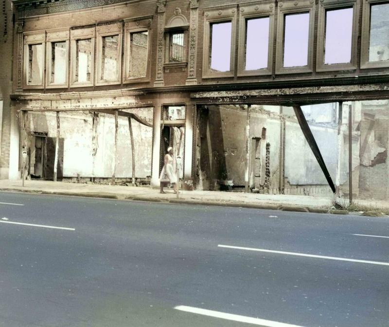 As the haze of smoke dissipated over Detroit in the days following the riot, 12th Street was revealed to be a 17 block ruin of jagged, fire scarred walls, ceilings collapsed into basements, shattered water pipes continued to flood any and all remaining cavities. Giant, twisted girders which once held up the thriving business district now look like melted licorice sticks that couldn't support their own weight.